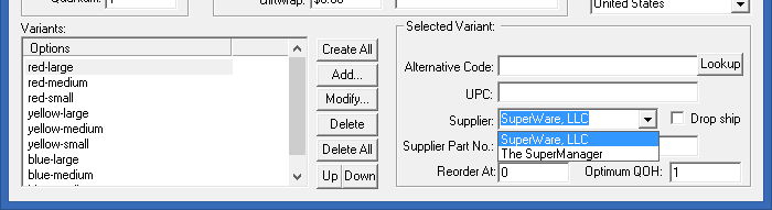 Once you have created variants, you may need to adjust some of the data for the variants. Two important things related to purchasing are the supplier and the re-order at setting. If you don’t currently have any suppliers defined, you will first have to create suppliers. This is found under “View”, “Suppliers” from the main menu in SuperManager. After creating the necessary supplier, you can come back to the product details, select the variant from the list on the bottom left and choose the supplier from the drop-down on the bottom right.