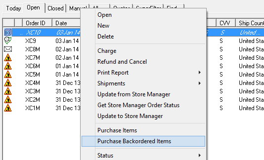 - When new orders come in and one or more of the items ordered are not available in inventory, SuperManager will automatically set the order statuses to backordered. You can select all backordered orders, right click and choose “Purchase Backordered Items”.