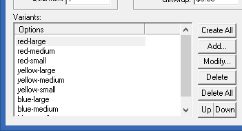 Once you have the options defined as you want them, look at the bottom right hand corner of the product details, where the variants are listed. If none exist you can click the “Create All” button for it to automatically generate all possible variants. You can click “Add…” to add one of the variants not yet created or add the default variant if you want just one variant for the product.